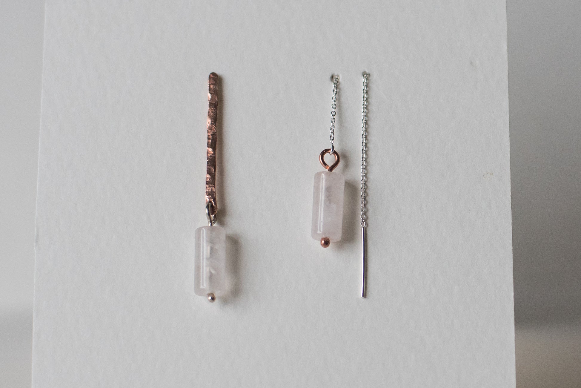 Handcrafted in solid copper and sterling silver. Sterling silver threader, ear post and backing.