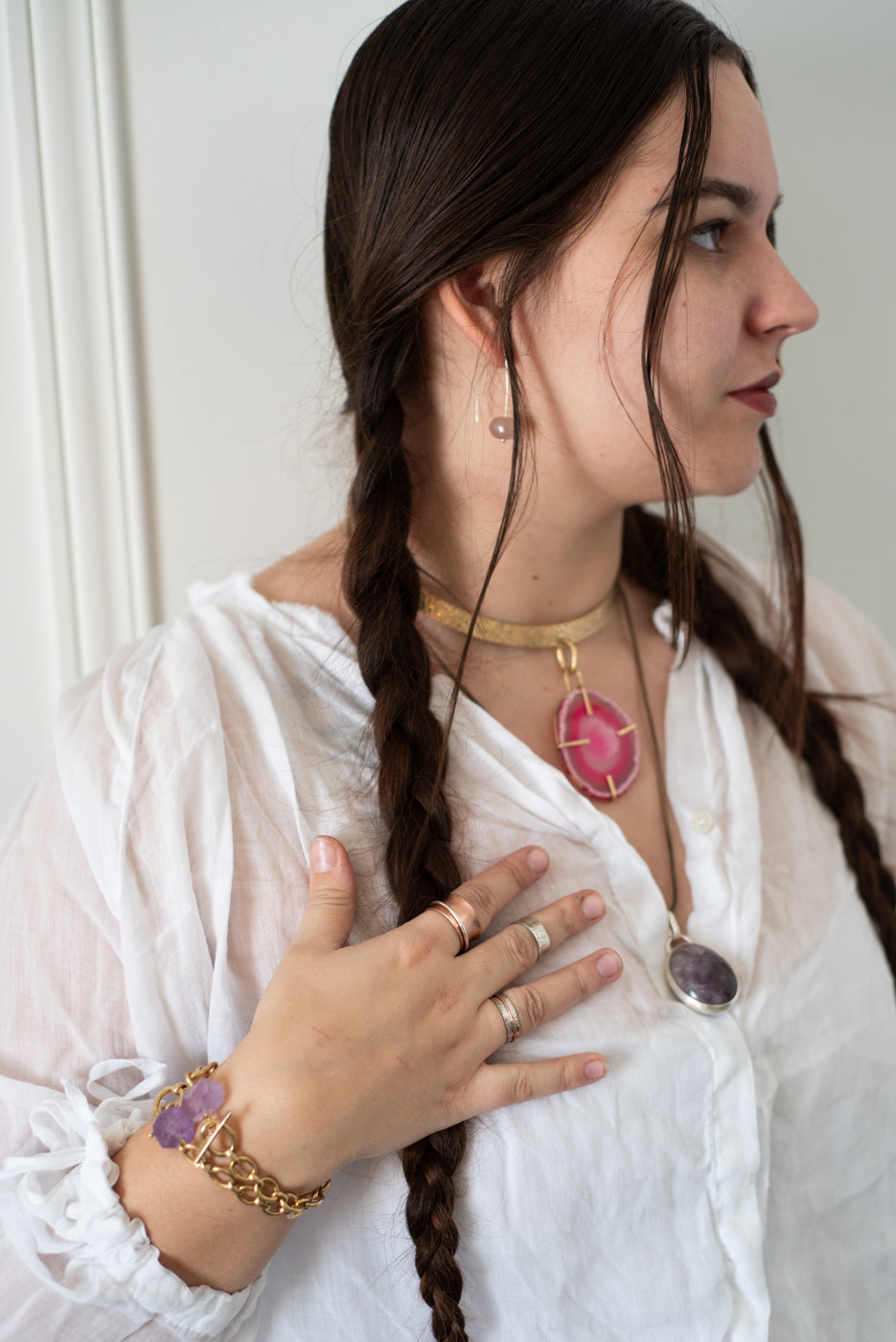 5-inch diameter flexible torque necklace. 2-inch opening with 2.5-inch chain extension. Hook & eye closure.