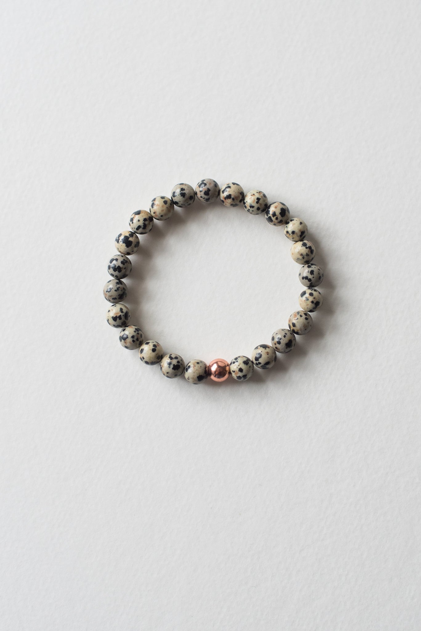 Handcrafted stretch strand of dalmatian jasper with solid copper accent.