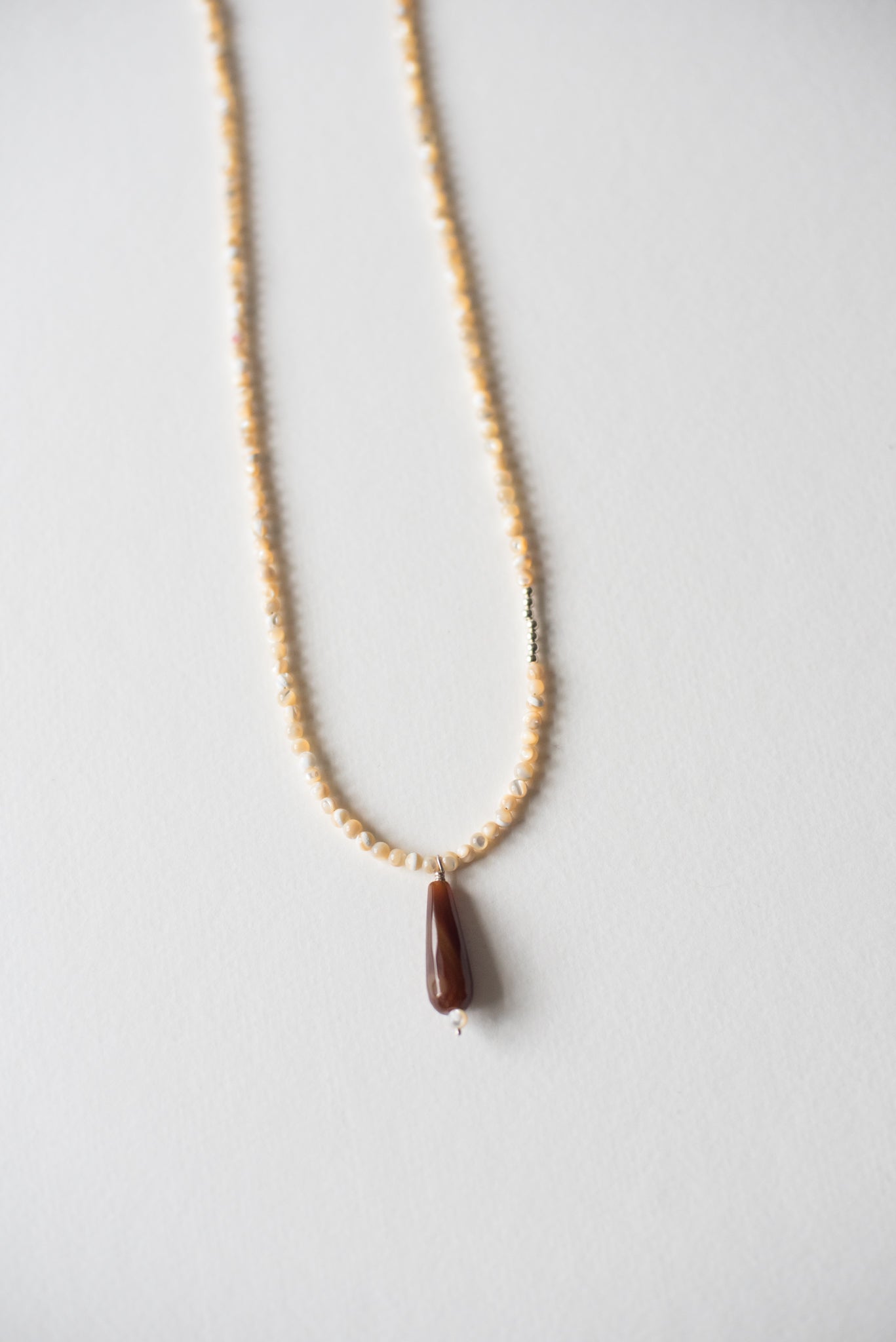 Handcrafted strand of mother of pearl, with agate and sterling silver accents.